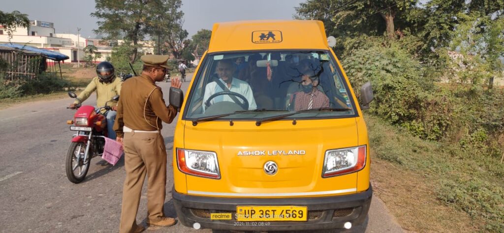 एवं बैंक प्रबंधक स्टेट बैंक ऑफ इंडिया तथा विद्यालय प्रबंधक मंसाराम मौर्य एवं अन्य गणमान्य व्यक्ति उपस्थित रहे, साथ ही स्कूली वाहनों से संबंधित चेकिंग अभियान व जागरूकता अभियान चलाया गया स्कूली वाहनों को रोककर उनको चेक किया गया तथा स्कूली वाहन चालकों को यातायात नियमों के प्रति जागरूक करते हुए वह ओवर स्पीड वाहन न चलाने,ओवरलोडिंग वाहन न चलाने एवं सीट बेल्ट लगाने तथा यात्रा नियमों का पालन करने के संबंध में हिदायत की गई तथा स्कूली वाहनों में लगे हुए अग्निशामक यंत्र एवं उनमें गति नियंत्रक उपकरण भी चेक किये गये । अभियान के दौरान यातायात नियमों का उल्लंघन करने वाले कुल 142 वाहनों का चालान करते हुए 1,83,000/- रुपए जुर्माना योजित किया गया किया गया ।
